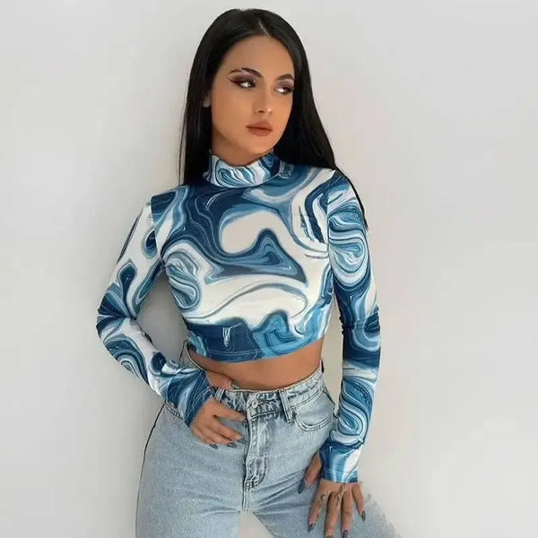 Bedruckter halber Rollkragen Pullover Crop Finger Sleeve Top
