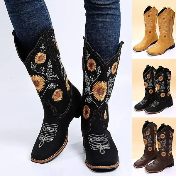 Cowboy Stiefel Frauen Sonnenblumen Stickerei Schuhe Niedriger Absatz