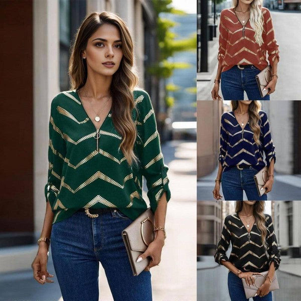 Lässiges Langarm-Shirt mit gestreiftem V-Ausschnitt für Damen
