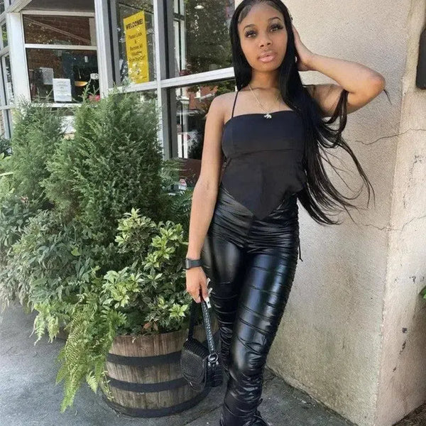 Enge plissierte Stretch-Lederhose mit hoher Taille