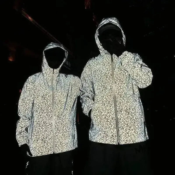 - Auffälliges reflektierendes Material: Diese Jacken sind aus hochsichtbarem, reflektierendem Material gefertigt, das bei Licht hell leuchtet, perfekt für nächtliche Sicherheit und auffällige Streetwear-Mode.