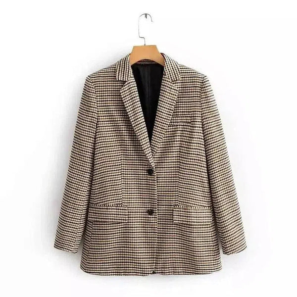 - Klassischer Hahnentritt-Blazer: Erweitern Sie Ihre Garderobe mit diesem zeitlosen Stück mit traditionellem Hahnentrittmuster in einer neutralen Farbpalette.