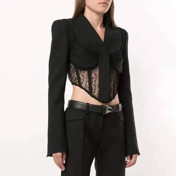 Elegante Spitzendetails: Der Blazer zeigt aufwendige Spitzenarbeiten, die dem Gesamtdesign einen Hauch von femininer Anziehungskraft verleihen, perfekt für diejenigen, die feine Handwerkskunst zu schätzen wissen.
