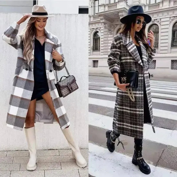 Karierter mittellanger Mantel Revers Krawatte Wollmantel