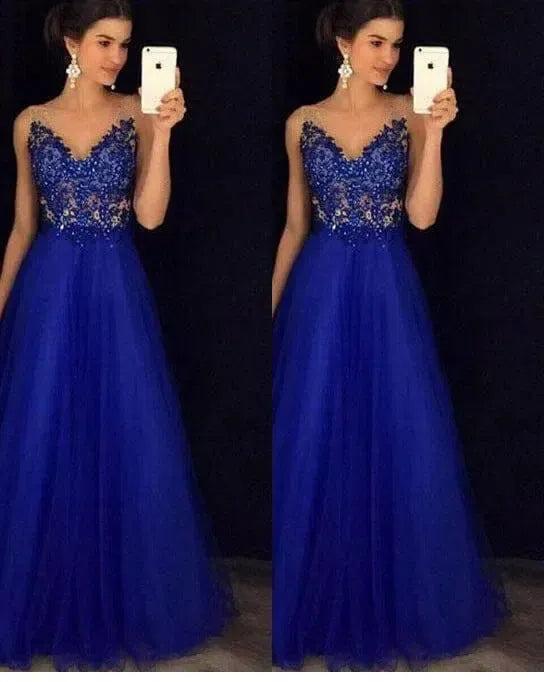 Produktbeschreibung: Blaues Chiffon Rückenfreies Perlen-Ballkleid