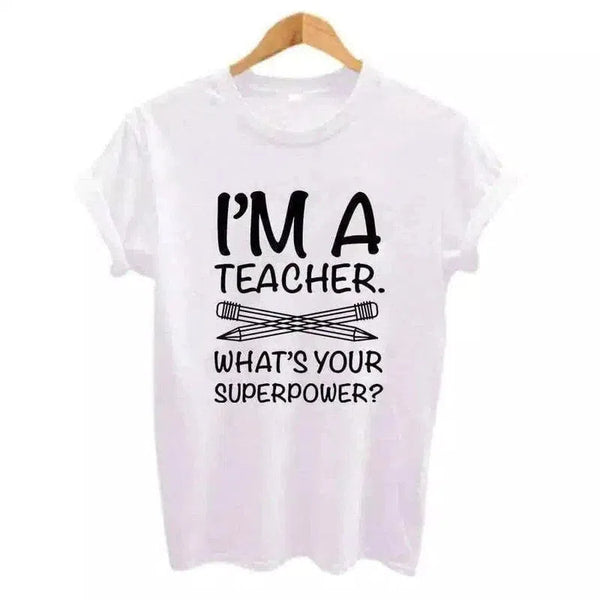 - Designmerkmale: Auf der Vorderseite befindet sich ein fetter typografischer Aufdruck mit der Phrase "I'M A TEACHER. WHAT'S YOUR SUPERPOWER?", begleitet von einer Grafik mit zwei gekreuzten Bleistiften unterhalb des Textes.
