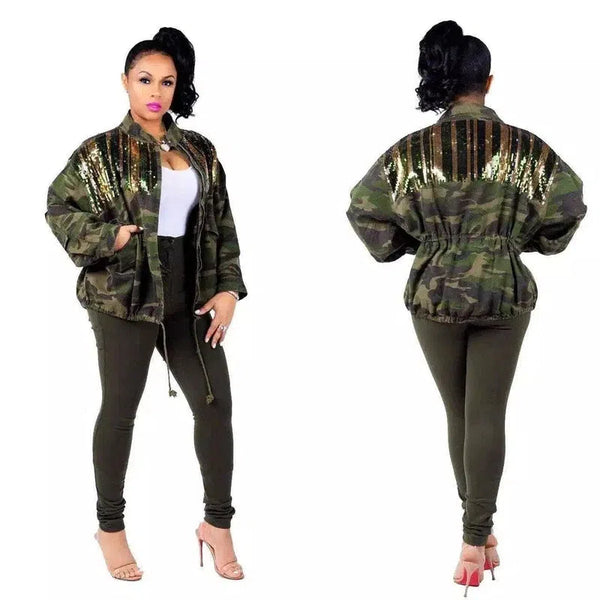 - Typ des Kleidungsstücks: Camouflage-Bomberjacke mit Paillettenverzierung
