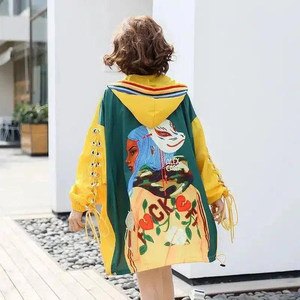 Bold Elements: Auf der Rückseite der Jacke befindet sich eine auffällige, großflächige Grafik mit leuchtenden Farben und künstlerischem Flair, die das Herzstück des Designs darstellt. Die Vorderseite ist eher zurückhaltend, so dass das Kunstwerk auf der Rückseite im Mittelpunkt steht.