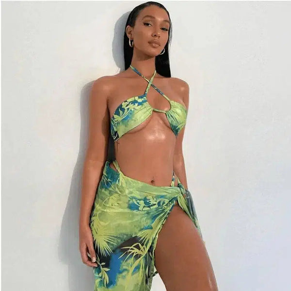 Dreiteilig Print Wickelbrust Neckholder Weste Minirock