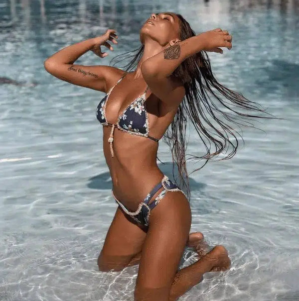 dunkelblauer handgestrickter Shell-Badeanzug mit Split-Body-Druck