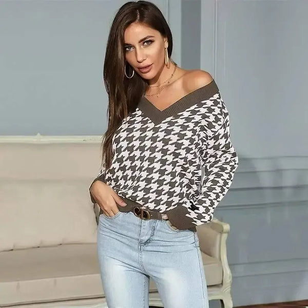 Damen Langärmelig Hahnentritt Jacquard V-Ausschnitt Base Gestrickt
