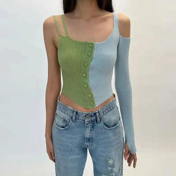 Zweifarbiges Damen-Strick-Crop-Top mit Knöpfen