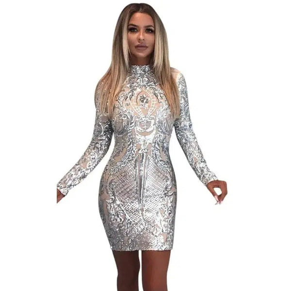 Hochgeschlossenes langärmeliges elegantes Partykleid mit Pailletten
