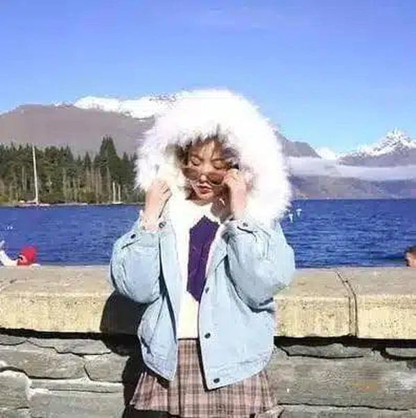 Lammfell-Jeansjacke mit Kapuze und Samt