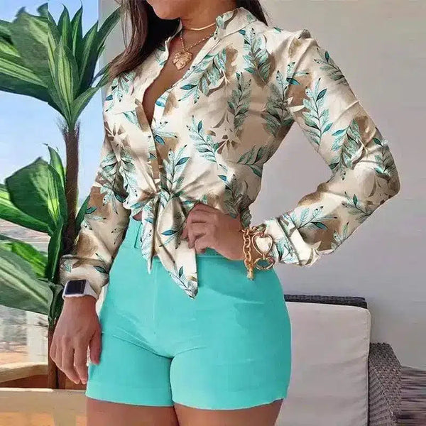 Set aus geblümter Krawattenbluse und taillierten Shorts