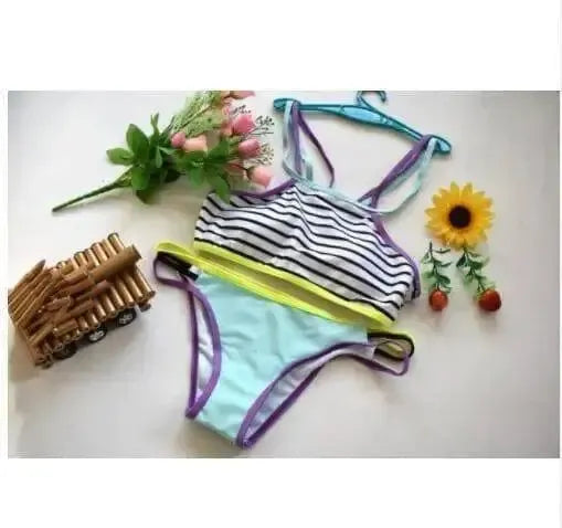 Stripped High Neck Patchwork Bikini Set Badeanzug Badeanzug