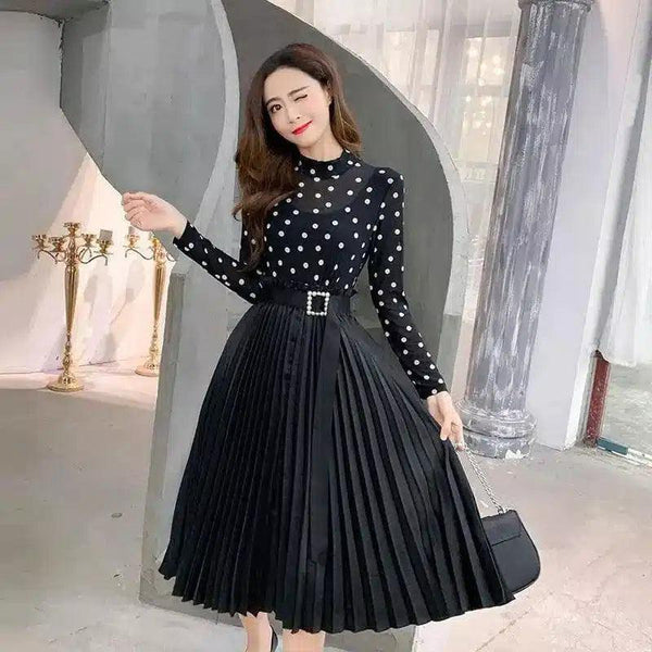 Gepunktetes plissiertes Midikleid mit Gürtel