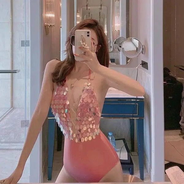 Paillettenbesetzter rückenfreier tiefer V geraffter Mode-Halfterneck