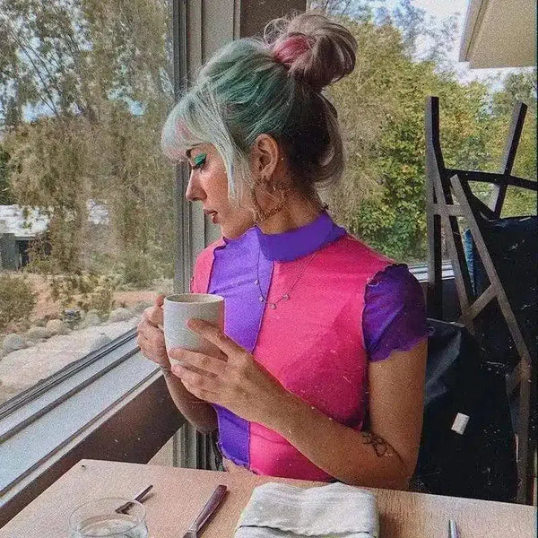 kontrastfarbiges kurzärmeliges Nabel-Top aus Mesh