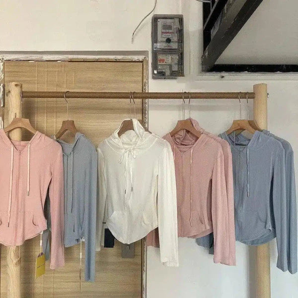 - Ausschnitt oder Schulterform: Kapuze mit Kordelzug