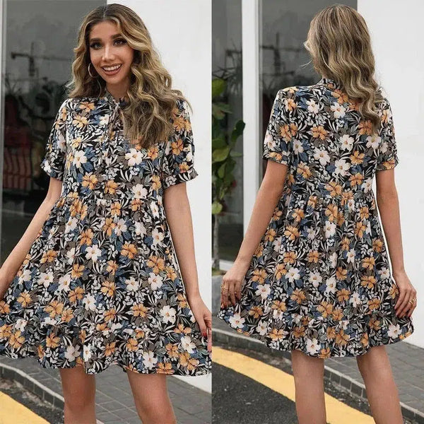 Stehkragen Ruffle Small Floral Kurzarmkleid