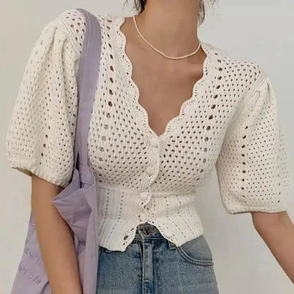Kurzarm-Strickjacke für Frauen mit Häkelmuster