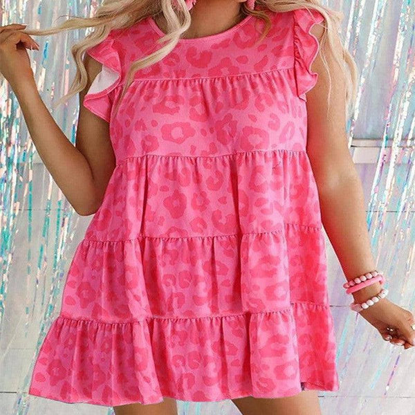 Sommer Leopardenmuster Rundhalsausschnitt Gerafftes Lagenminikleid