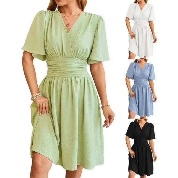 Kurzärmeliges Kleid mit V-Ausschnitt Mode Kleid mit Glockenärmeln Sommer Damenkleidung